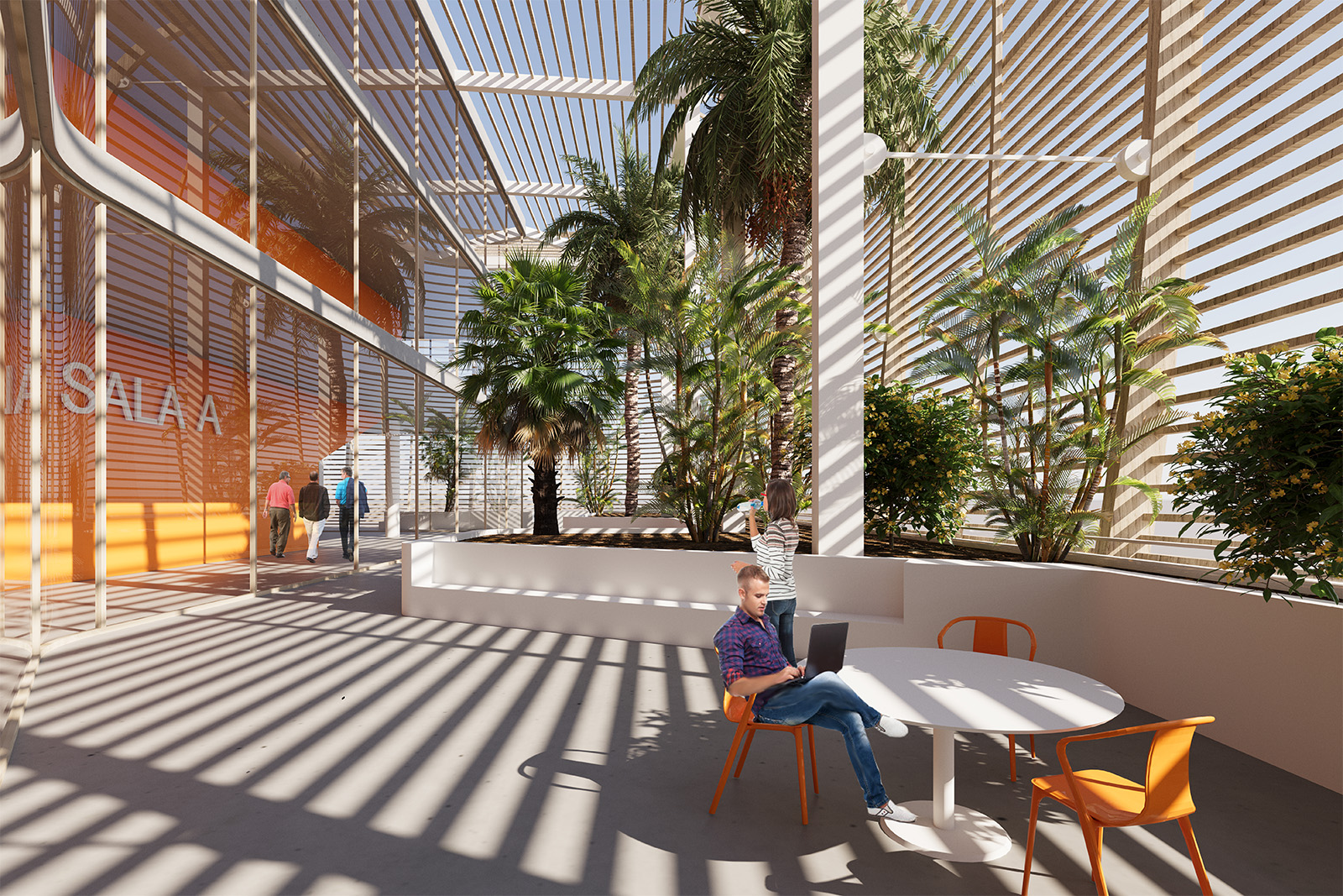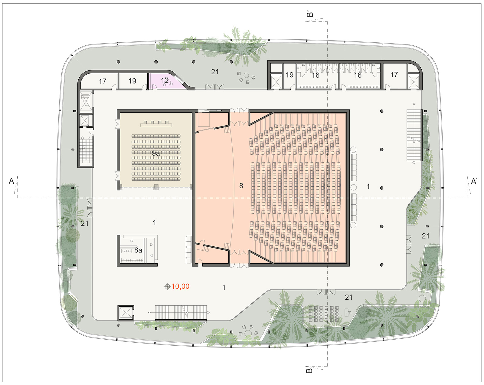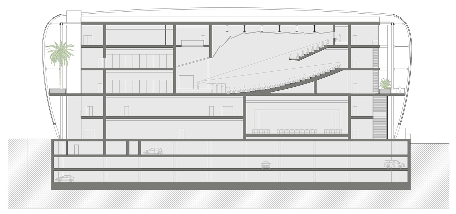 Dal piano terra al quarto piano, le sale conferenze, i servizi al pubblico a piano terra e gli uffici formano il nucleo centrale dell’edificio; questo nucleo di funzioni principali è circondato da un percorso ad anello e da una fascia, costituita sia da ambienti interni che all’aperto, che si sviluppa lungo tutto il perimetro e nella quale trovano posto i collegamenti verticali – scale e ascensori – gli spazi di incontro e quelli per la preparaziobe degli eventi, i servizi igienici, i depositi e gli ambienti tecnici. Un ampio spazio all’aperto dedicato al relax e alla socializzazione si estende poi dal secondo al quarto piano. Questo spazio esterno è ispirato agli umbracle, le grandi strutture presenti nei giardini botanici dell’Europa mediterranea che, caratterizzati da ampie coperture frangisole, ospitano varie specie di piante tropicali.
